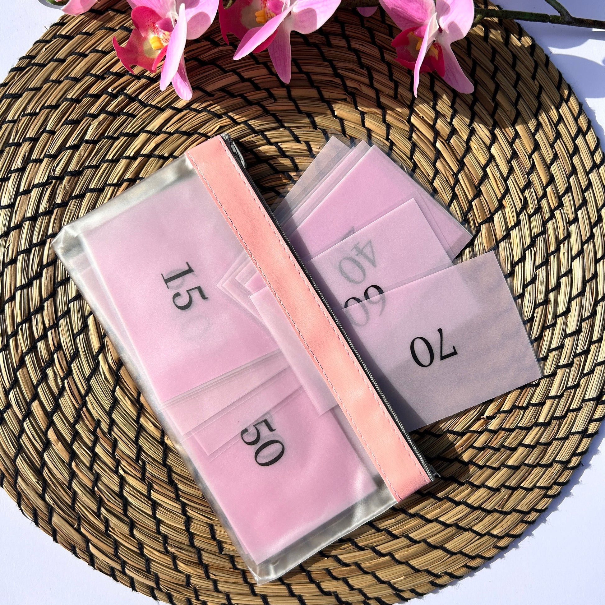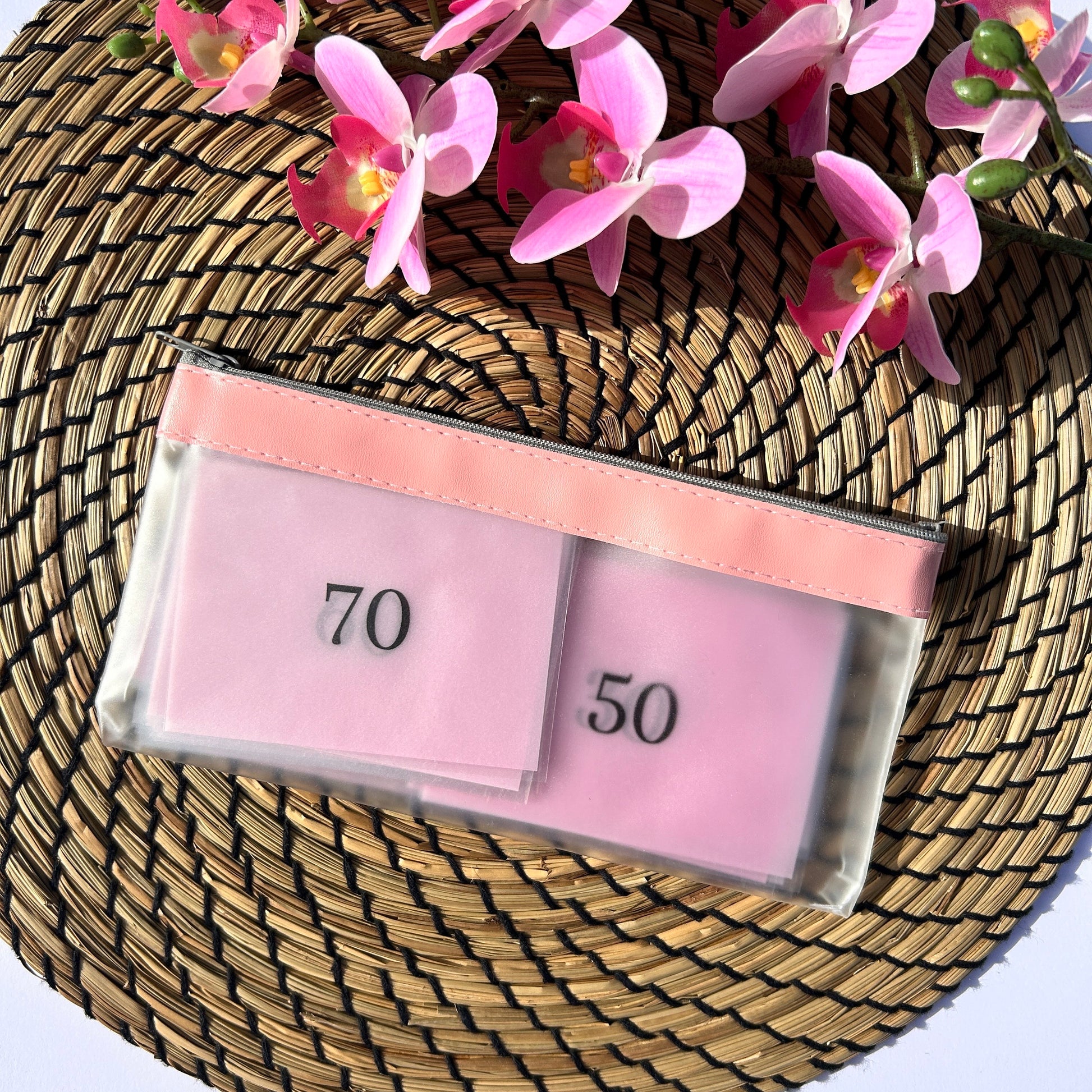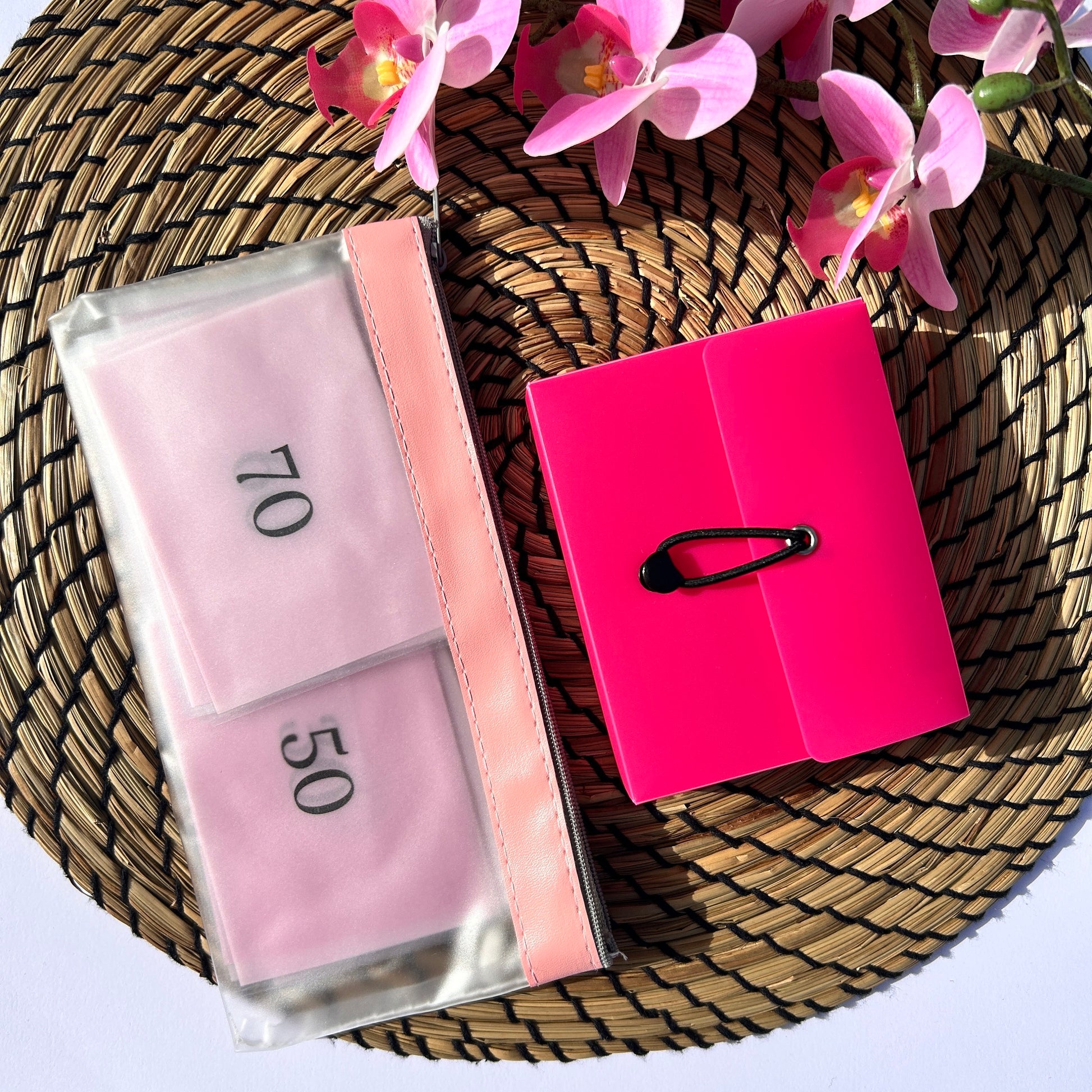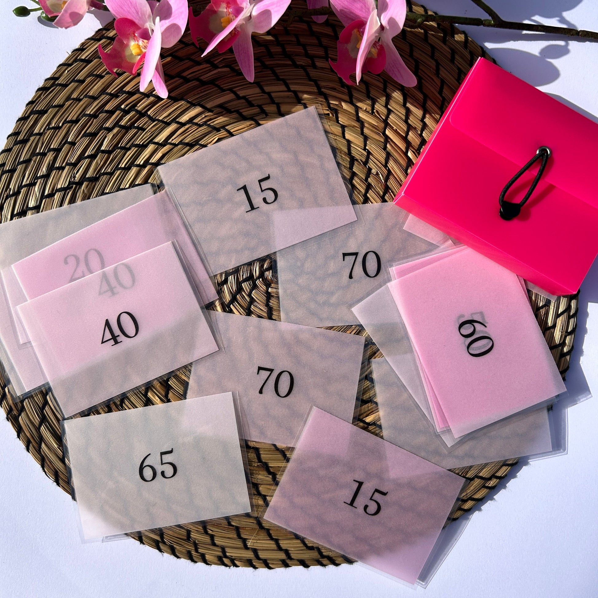 Wähle wahlweise die Challenge mit einem Cashstuffing Mäppchen, einem Mini Ordner oder nur die Umschläge. Die Karten sind in hellrosa gedruckt.