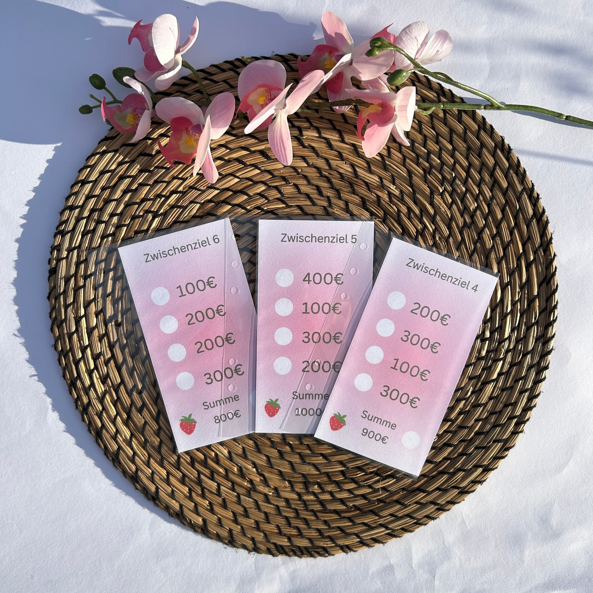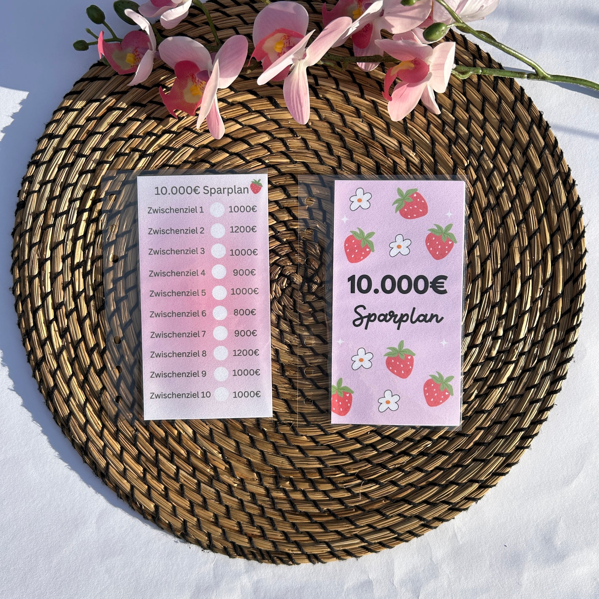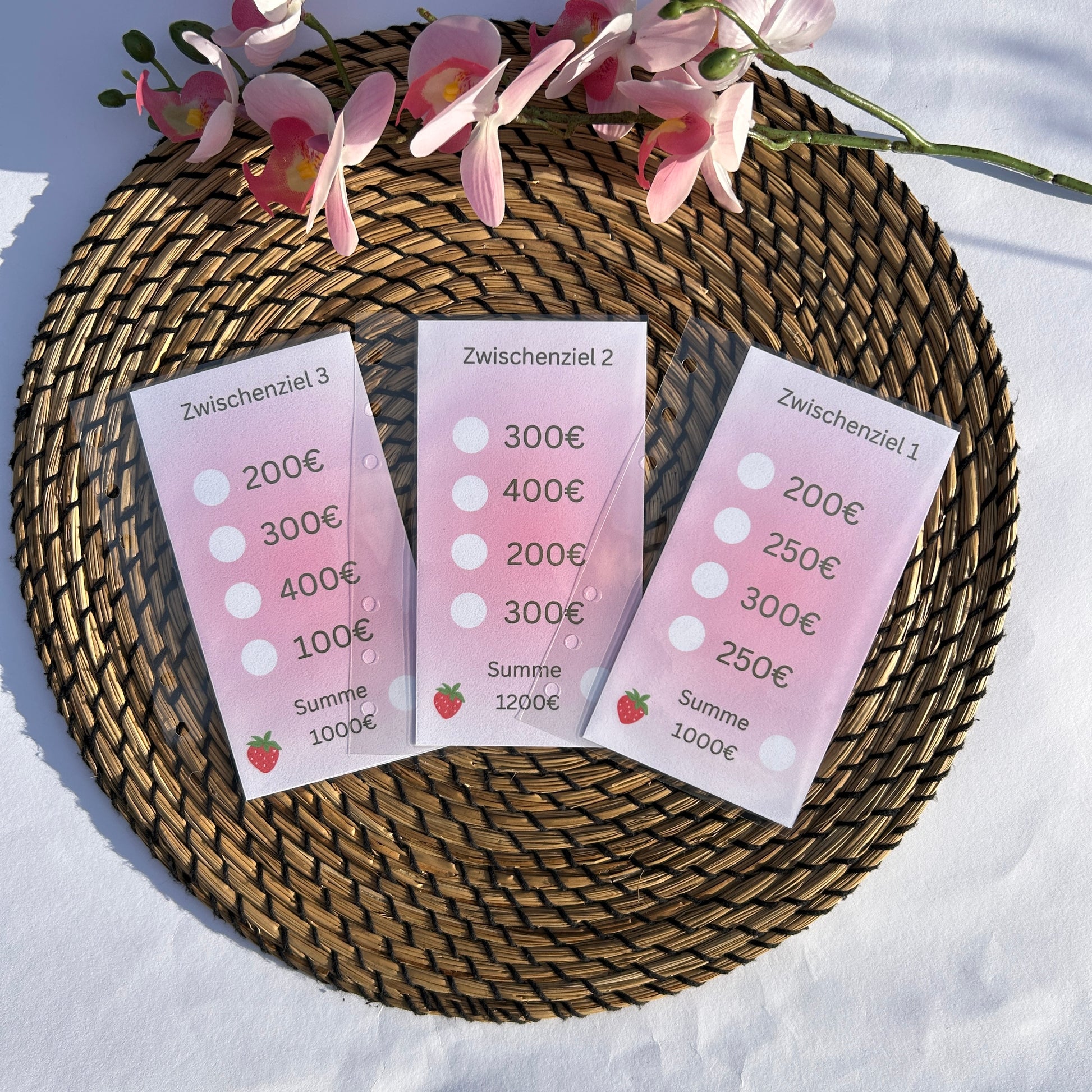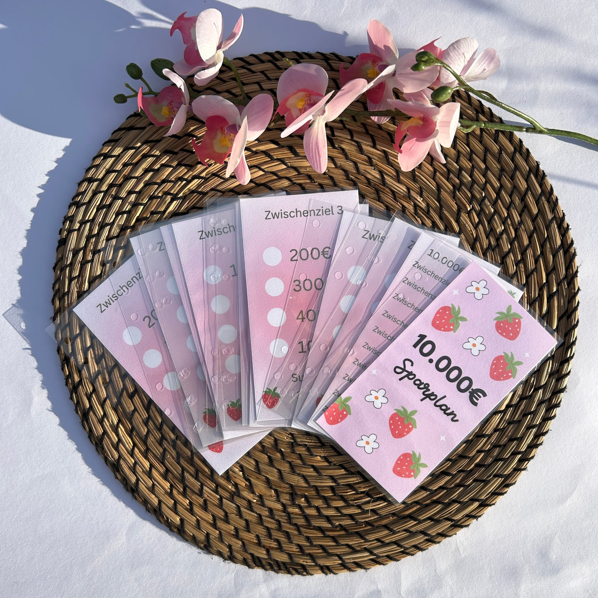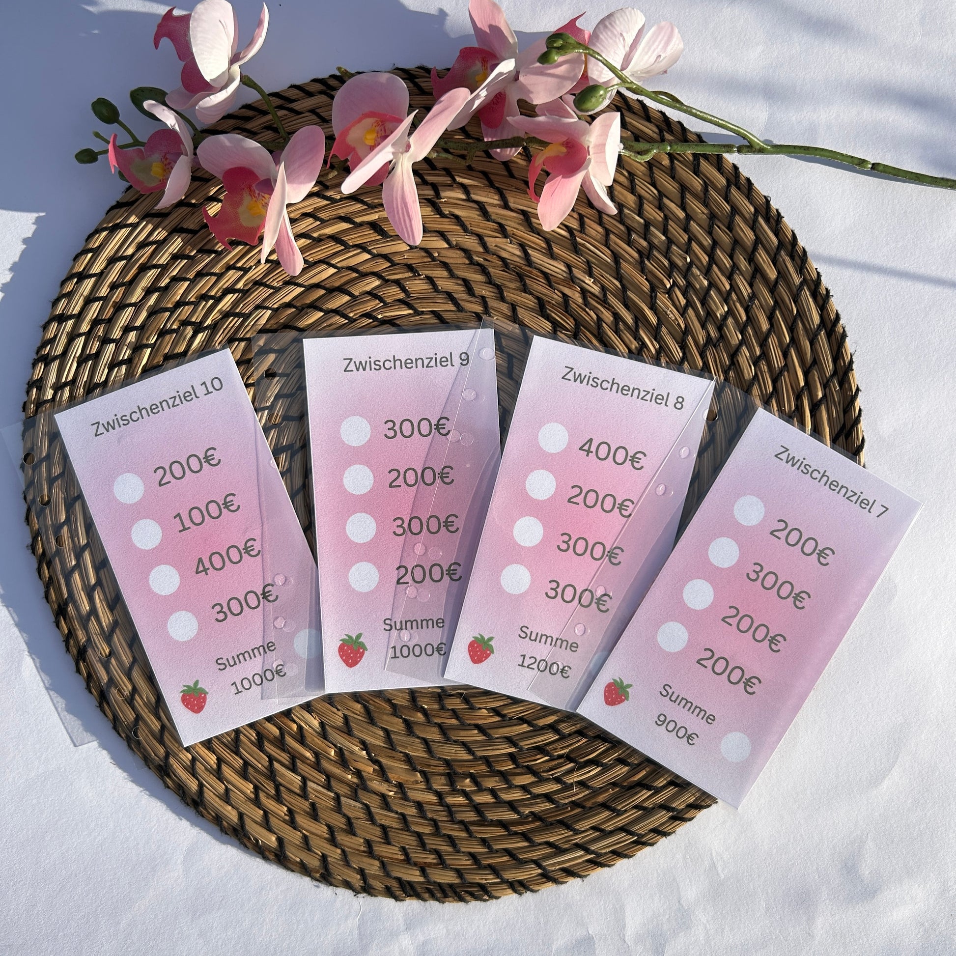 Mit dieser Sparchallenge kannst du 10000€ sparen. Der Sparplan ist aufgeteilt in 10 Zwischenziele die bespart werden. Am Anfang der Challenge hast du einen Tracker auf dem du die Zwischenziele ankreuzen kannst sobald du das jeweilige Zwischenziel bespart hast. Jedes Zwischenziel besteht auch kleineren Zielen. Kreuze dafür auf jedem Ziel den Betrag ab den du sparen willst und packe es in den Zipumschläg hinein.