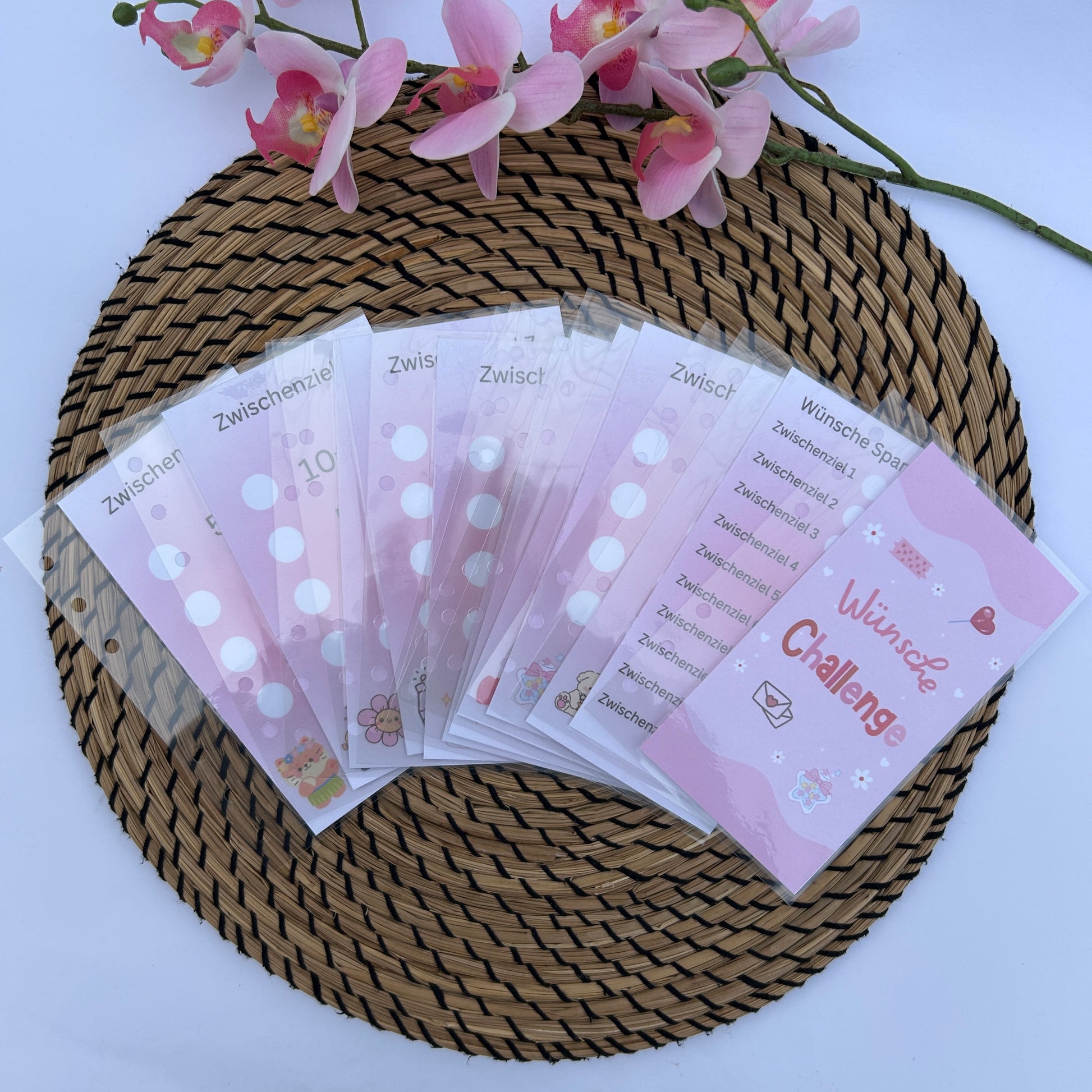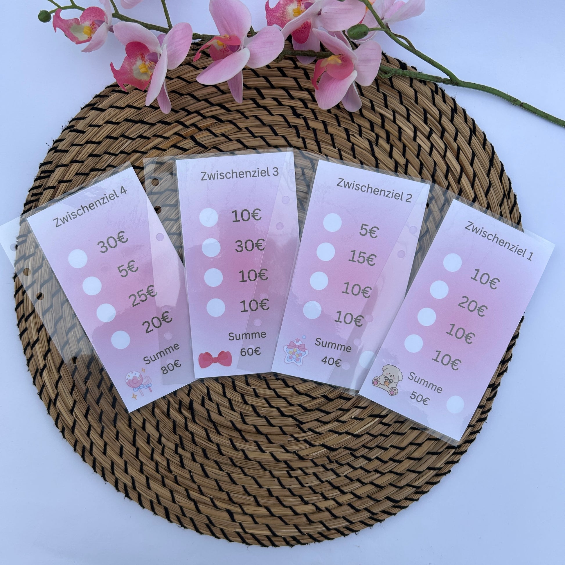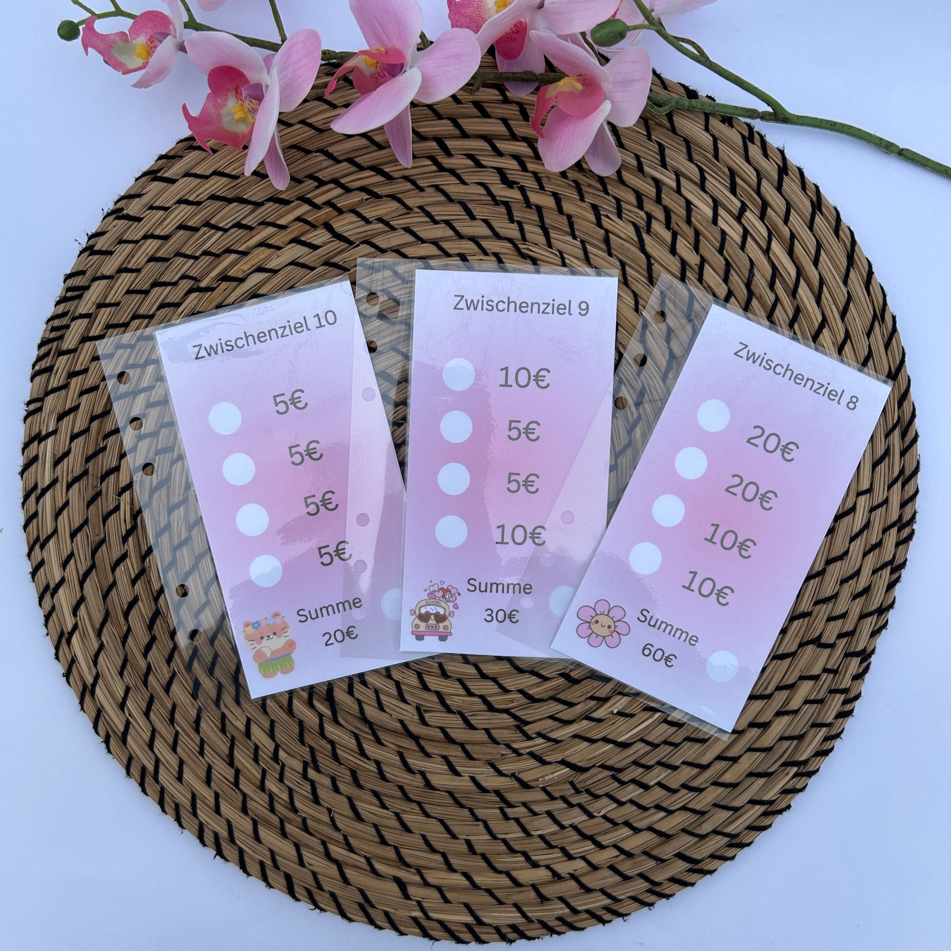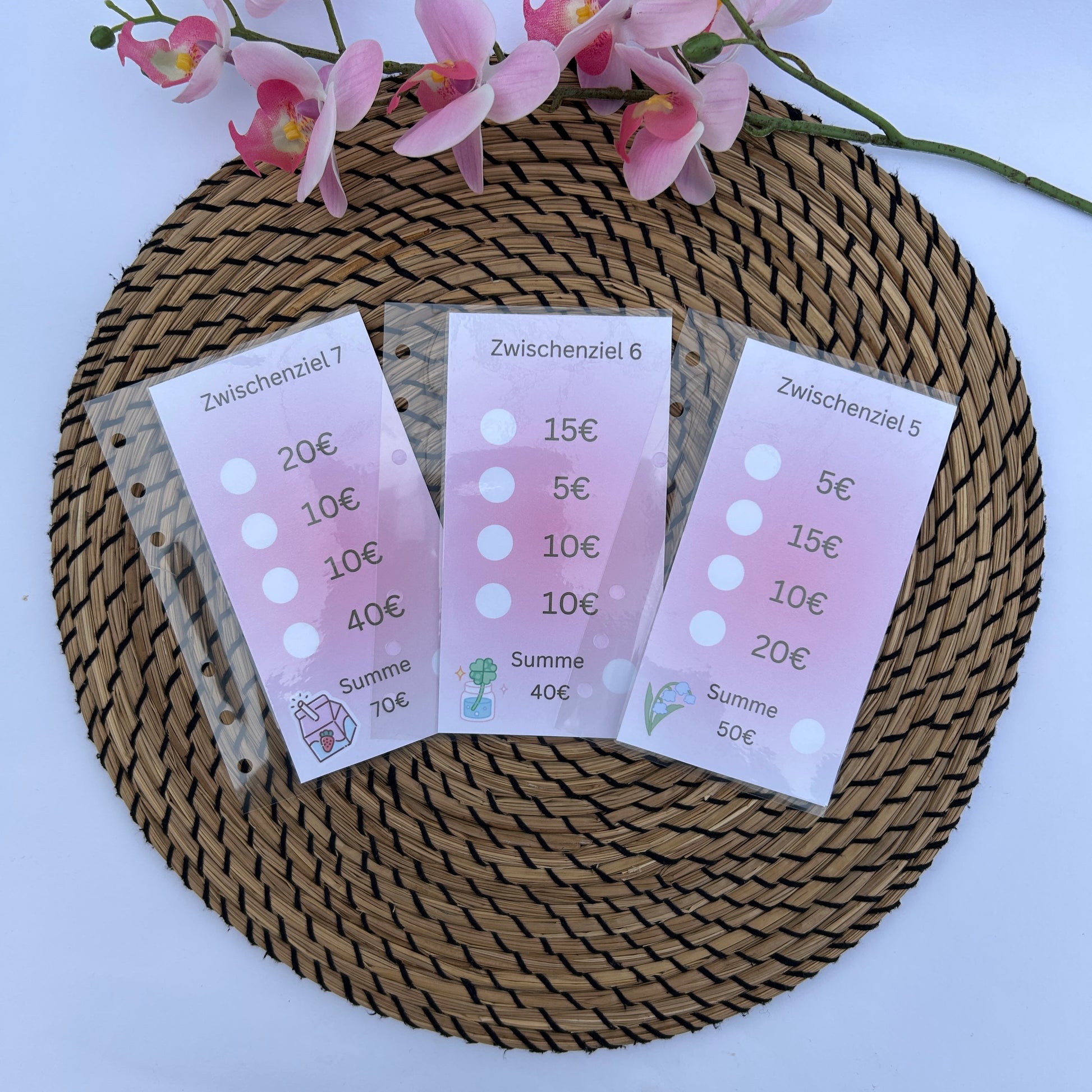 Mit dieser Sparchallenge kannst du 500€ sparen. Der Sparplan ist aufgeteilt in 10 Zwischenziele die bespart werden. Am Anfang der Challenge hast du einen Tracker auf dem du die Zwischenziele ankreuzen kannst sobald du das jeweilige Zwischenziel bespart hast. Jedes Zwischenziel besteht auch kleineren Zielen. Kreuze dafür auf jedem Ziel den Betrag ab den du sparen willst und packe es in den Zipumschläg hinein.