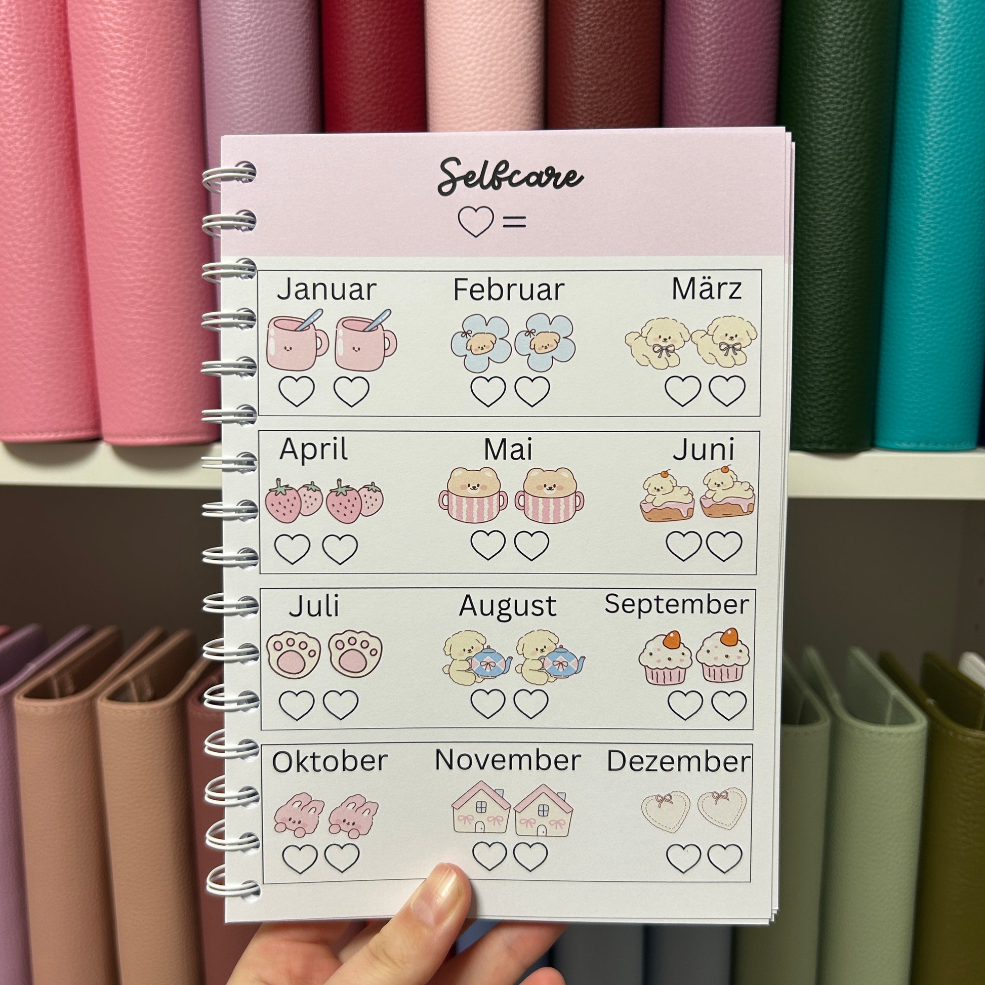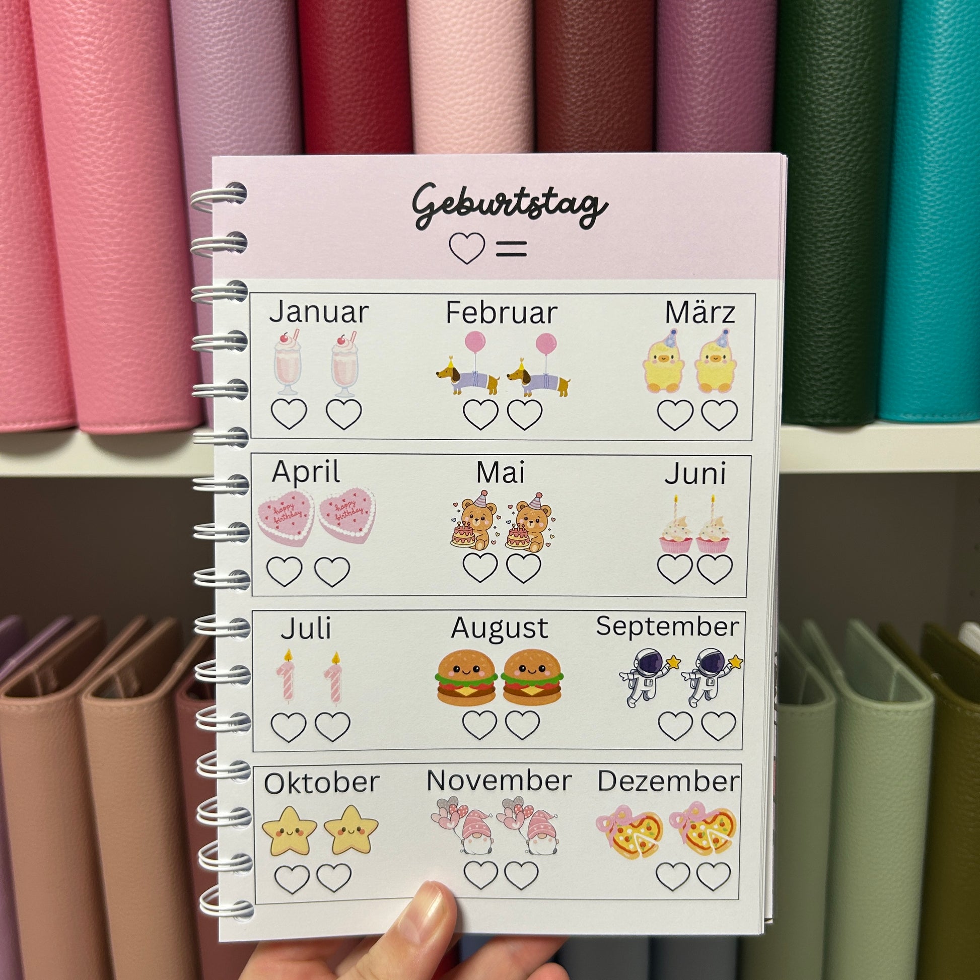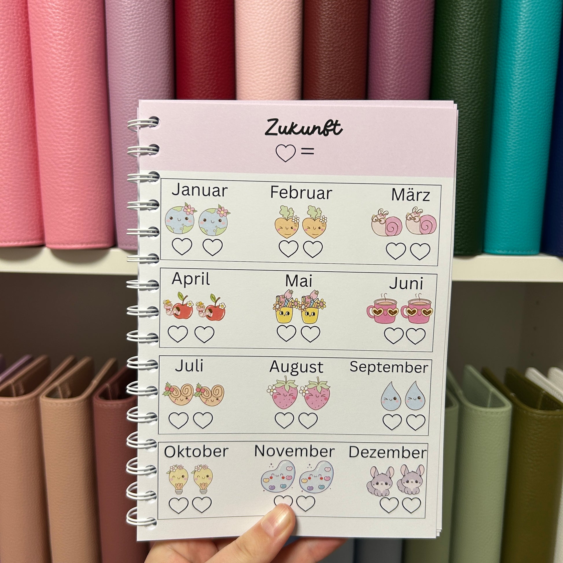 Das Buch beinhaltet 30 Jahressparchallenges. Jeden Monat kannst du auf jeder Challenge zwei Beträge sparen die du selbst auswählen kannst. Hast du das Geld gespart kannst du die Herzen anmalen und das Geld weglegen.