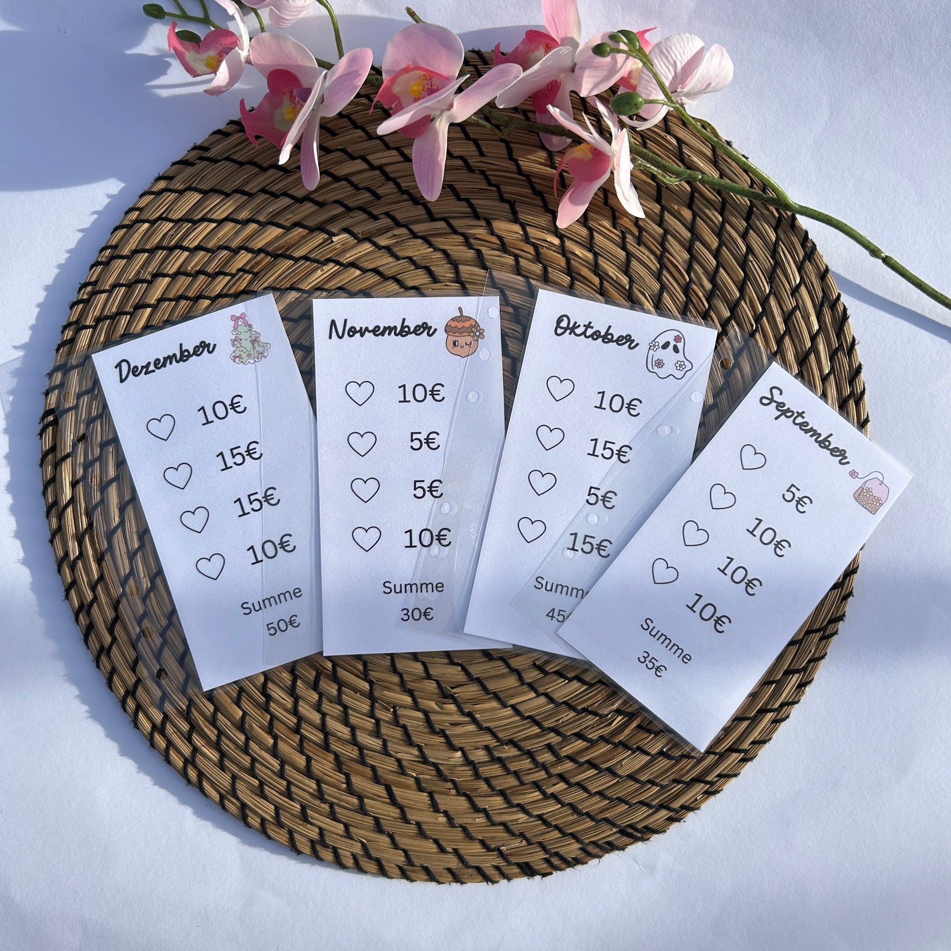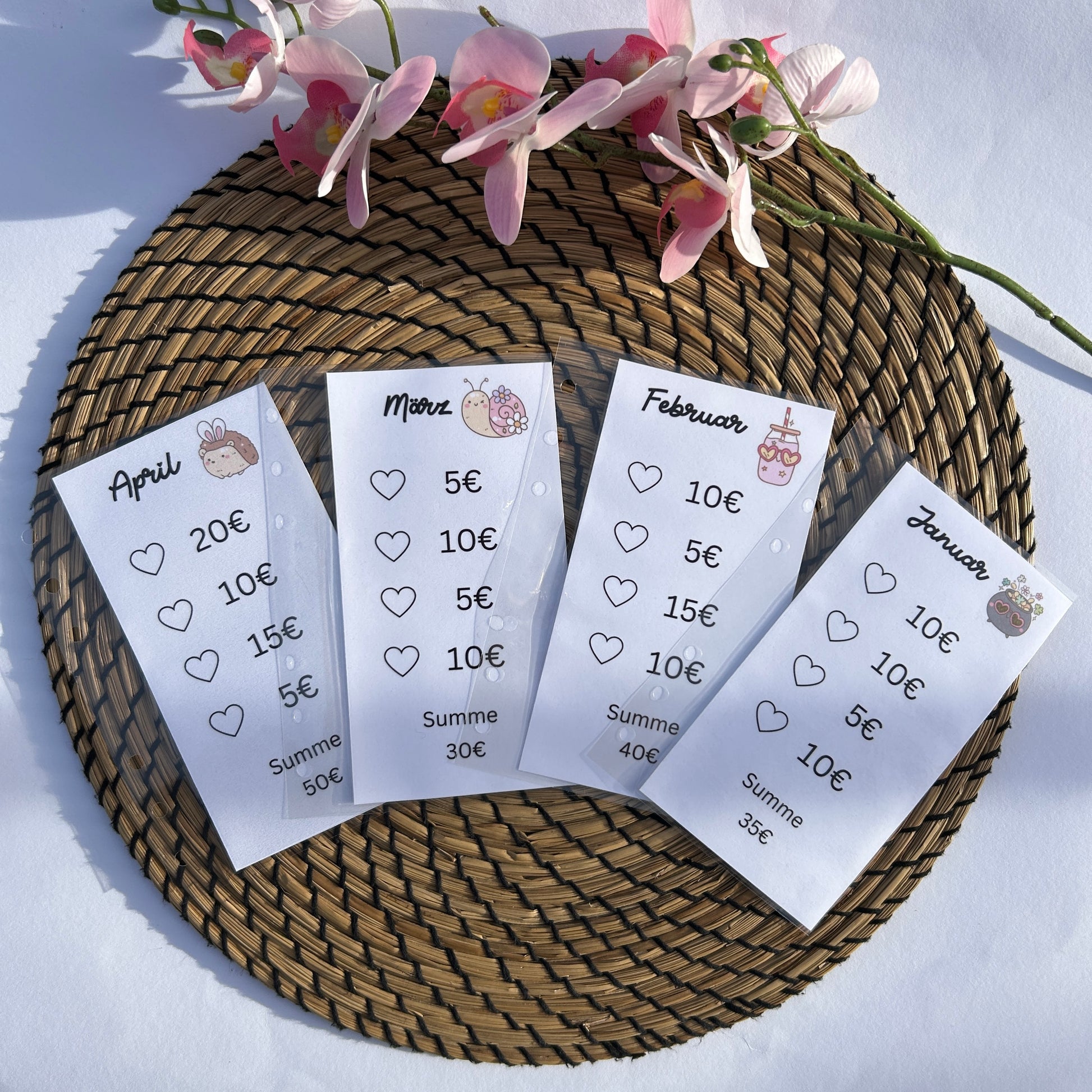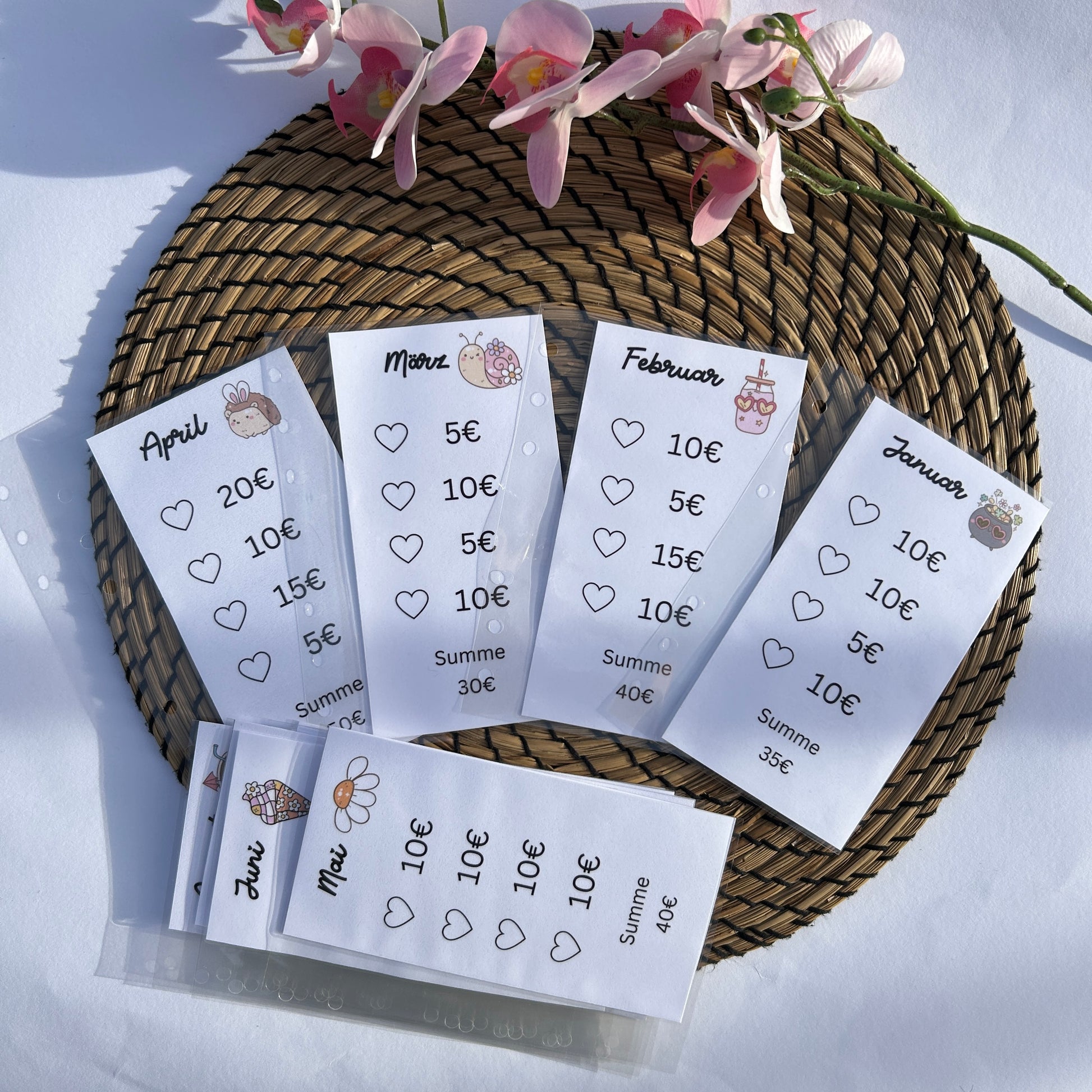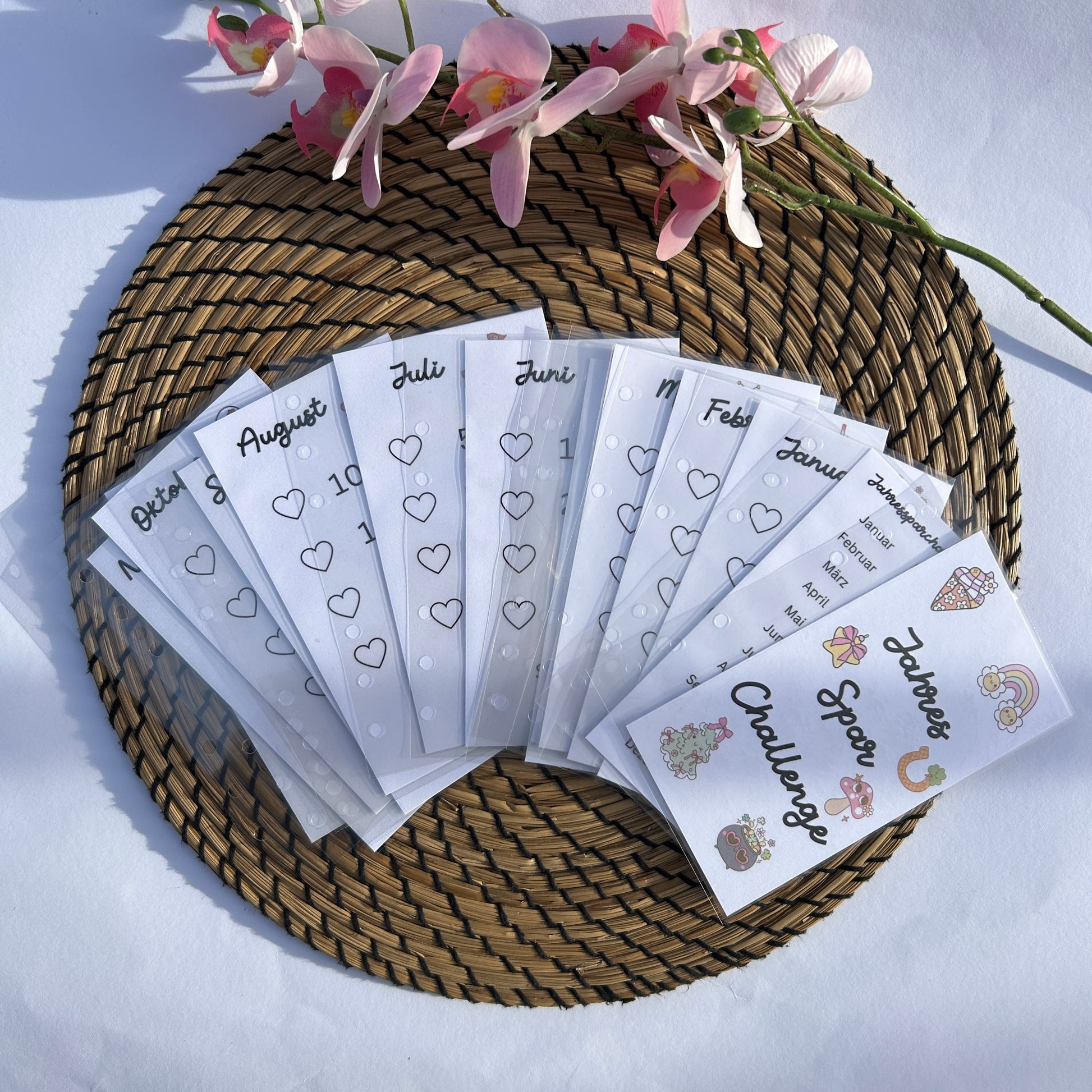 Die Jahressparchallenge eignet sich super um das ganze Jahr über zu sparen. Für jeden Monat gibt es eine Sparchallenge. Im Set sind die 12 Sparchallenges enthalten, ein Jahrestracker um jeden Monat zu Tracker. Insgesamt könnt ihr 500€ mit dieser Challenge sparen.