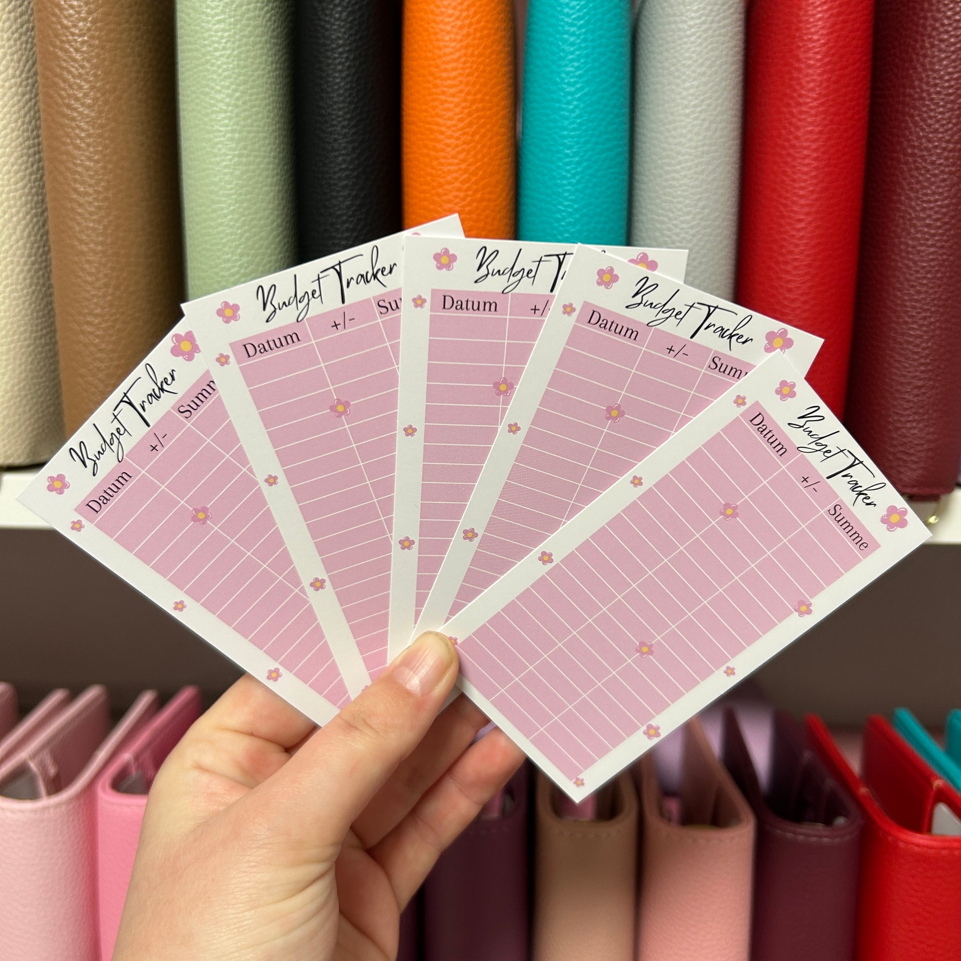 Trage jedes Mal wenn du Geld aus deinem Umschlag nimmst in deine Budget Tracker ein was du ausgegeben hast. Trage zuerst das Datum ein, dann ob du etwas weg oder dazu gelegt hast und was danach in deinem Umschlag für eine Summe ist. So hast du den perfekten Überblick was du ausgegeben hast