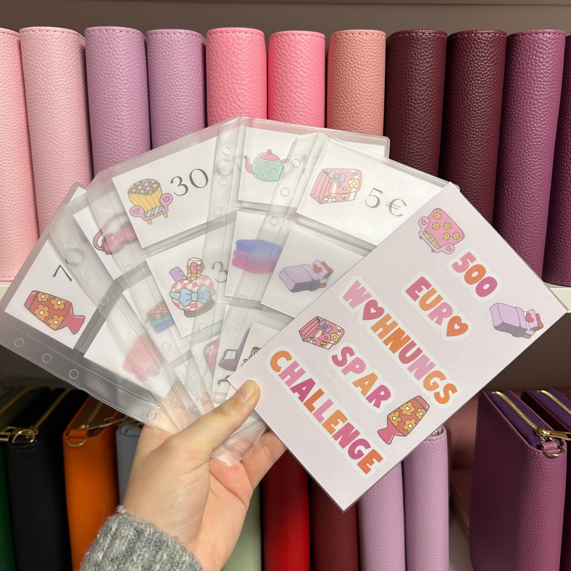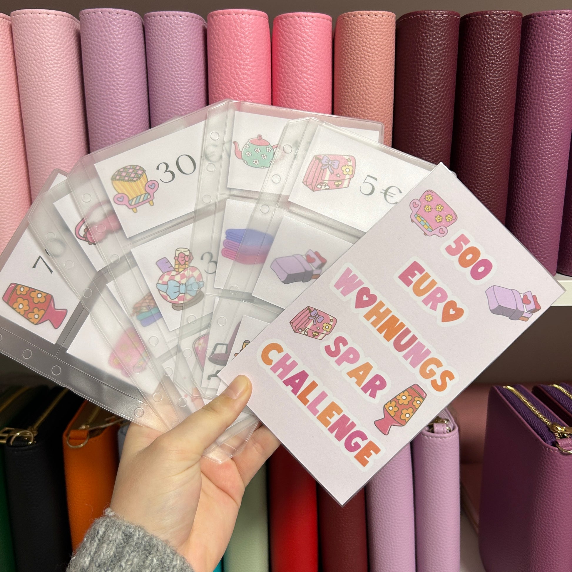 Mit der Wohnungs Mini Sparchallenge könnt ihr ganz einfach 500 Euro sparen. Die Challenge beeinhaltet 13 Zwischenziele zwischen 5 und 80€ die ihr besparen könnt. Die Zwischenziele lassen sich aus den Folien raus holen und können angekreuzt werden sobald ihr das Geld rein legt. Habt ihr alle Zwischenziele beendet habt ihr 500€ gespart.