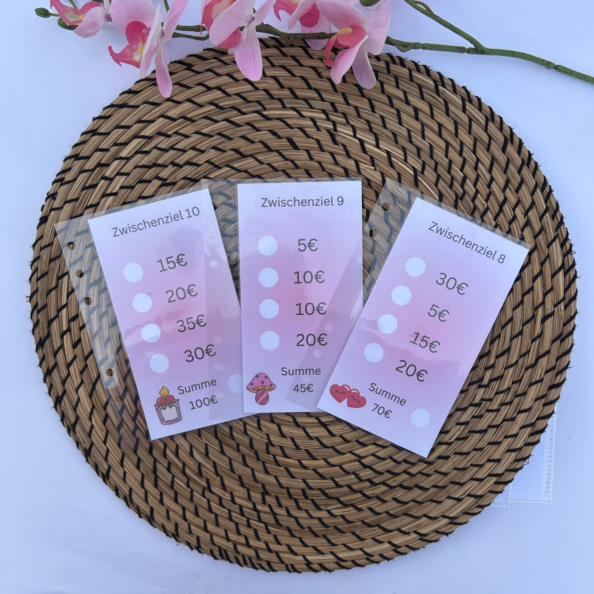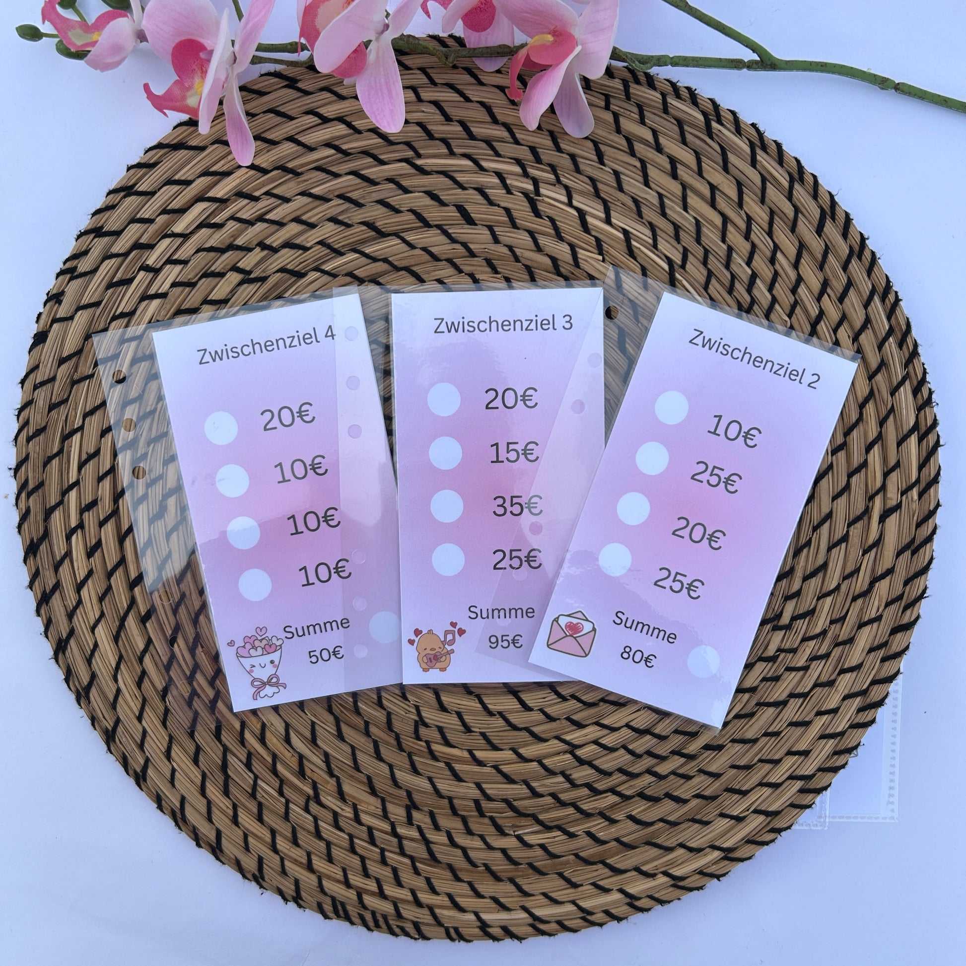 Mit dieser Sparchallenge kannst du 500€ sparen. Der Sparplan ist aufgeteilt in 10 Zwischenziele die bespart werden. Am Anfang der Challenge hast du einen Tracker auf dem du die Zwischenziele ankreuzen kannst sobald du das jeweilige Zwischenziel bespart hast. Jedes Zwischenziel besteht auch kleineren Zielen. Kreuze dafür auf jedem Ziel den Betrag ab den du sparen willst und packe es in den Zipumschläg hinein.