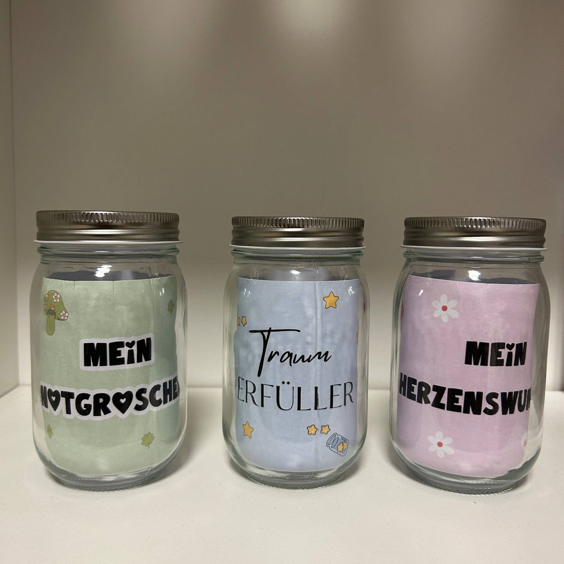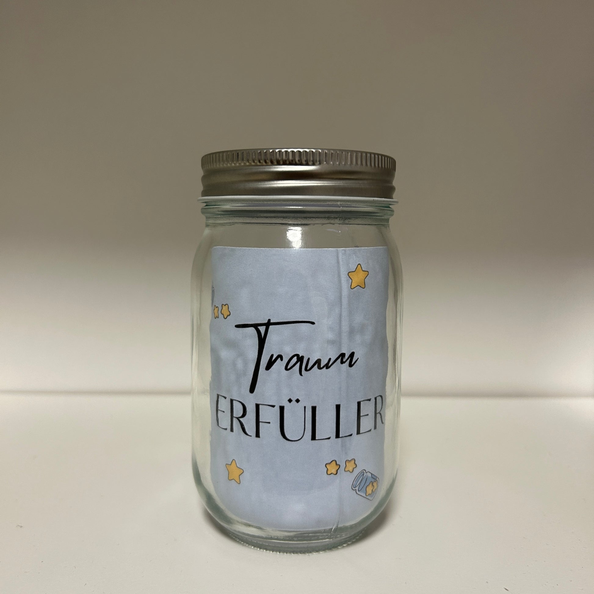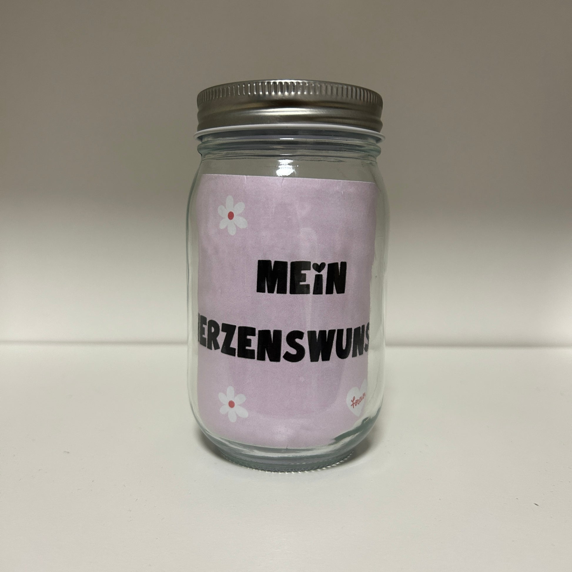 Dieses Sparglas eignet sich perfekt um dein Geld zu sparen und Kleingeld zu verstauen. Der Decker ist abdrehbar und das Glas ist ca 13,5 x 8 cm groß. Wähle zwischen den Einlagen Herzenwunsch, Traumerfüller ohne wähle das Glas ohne Einlage.